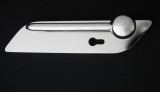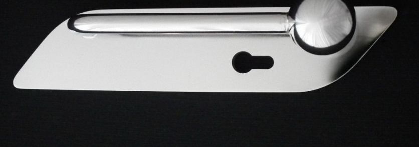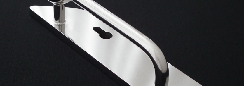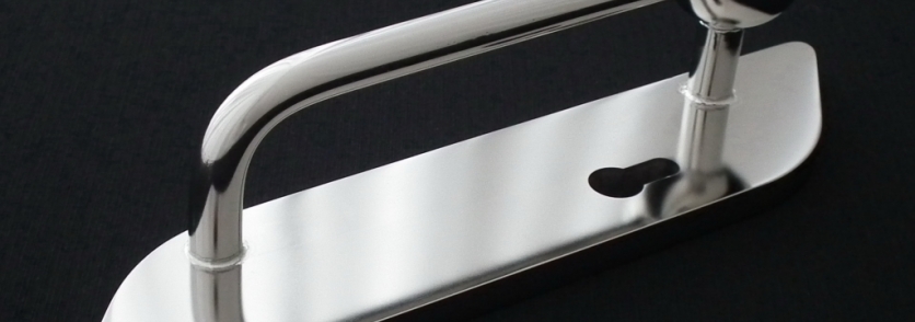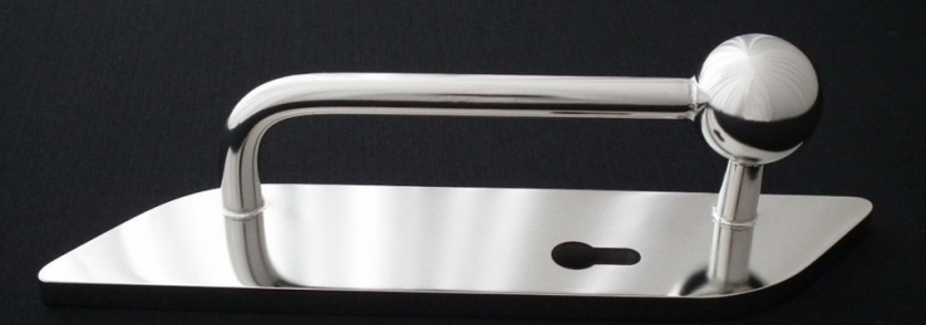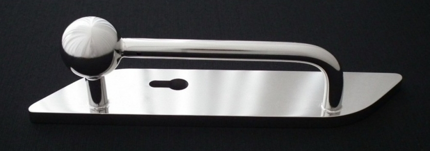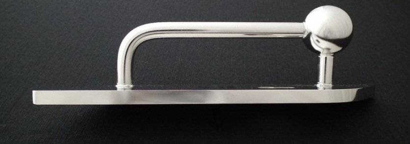 Basisplaat van massief rvs met afmetingen van 12x70x320mm. Daarop gelast de voorgevormde massieve staven. De staven zijn onderling verbonden door een bol van 50mm. De totale hoogte bedraagt 90mm. Het oppervlak is fijn geborsteld en daarmee zijdeglanzend van uiterlijk. Voor € 281,-