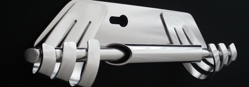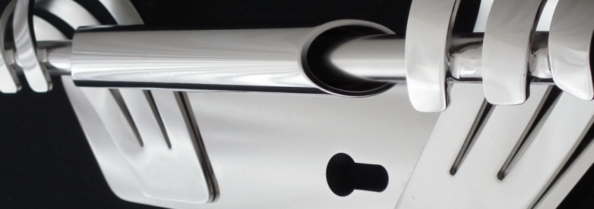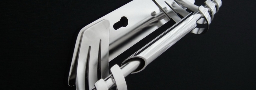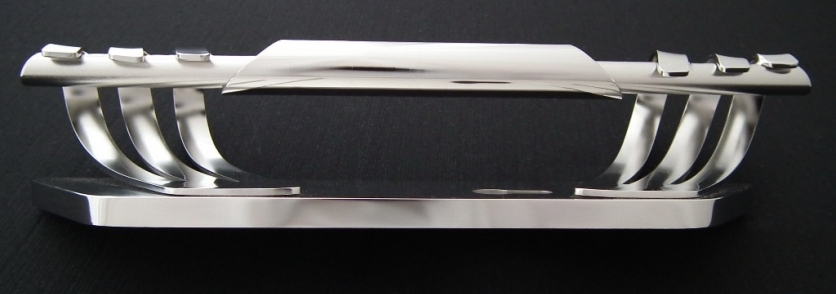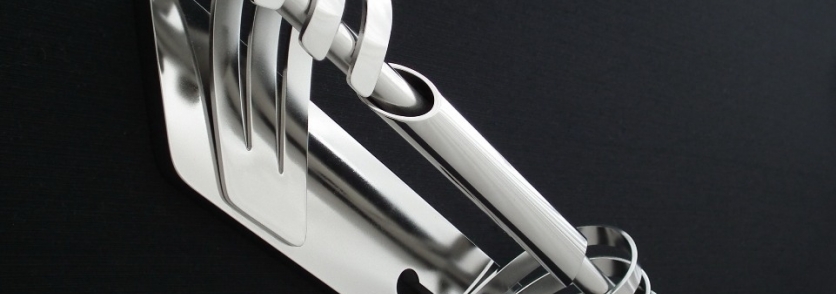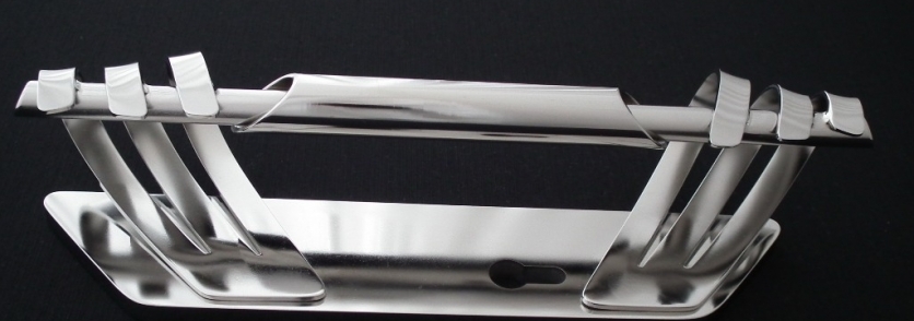 Basisplaat van massief rvs met afmetingen 12x70x340mm. Daarop twee gebogen plaatvormen die aan de zes uiteinden een massieve staaf "omarmen". Het buisdeel met eindafschuining is voor een betere grip. De buitenwerkse maten bedragen 110mm x 80mm x 400mm (bxhxl). Het oppervlak is fijn geborsteld en daarmee zijdeglanzend van uiterlijk. Voor € 377,-