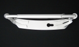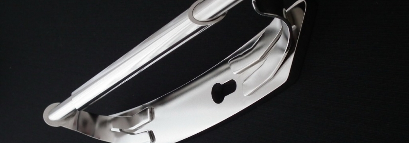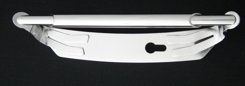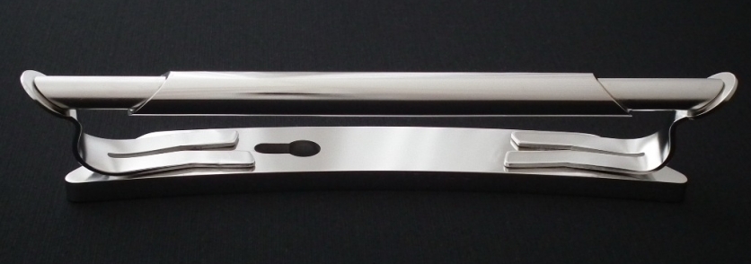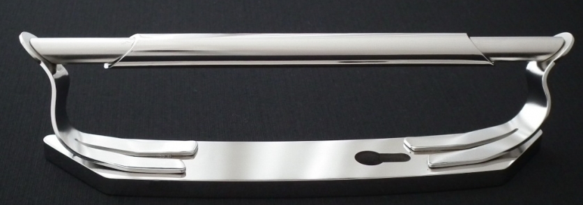 Basisplaat van massief rvs met afmetingen 12x50x315mm. Daarop twee gebogen plaatvormen met aan de uiteinden onder schuinte een staaf. Het buisdeel ter verfraaiing en voor betere grip. De buitenwerkse maten bedragen 80x80x340mm (bxhxl). Het oppervlak is fijn geborsteld en daarmee zijdeglanzend van uiterlijk. Voor € 298,-