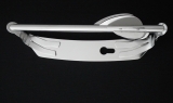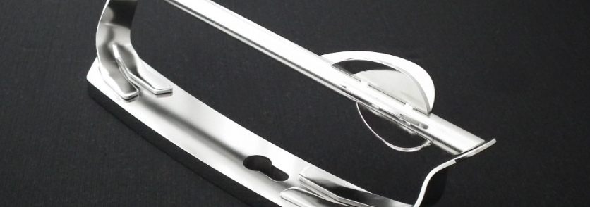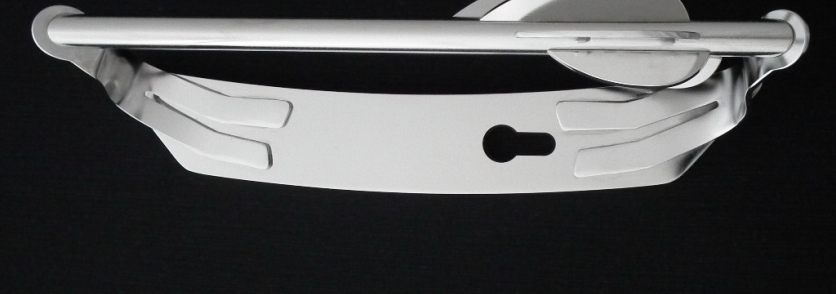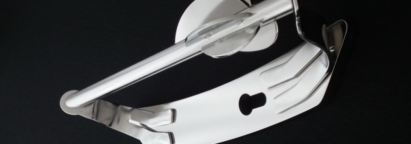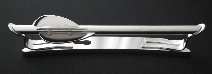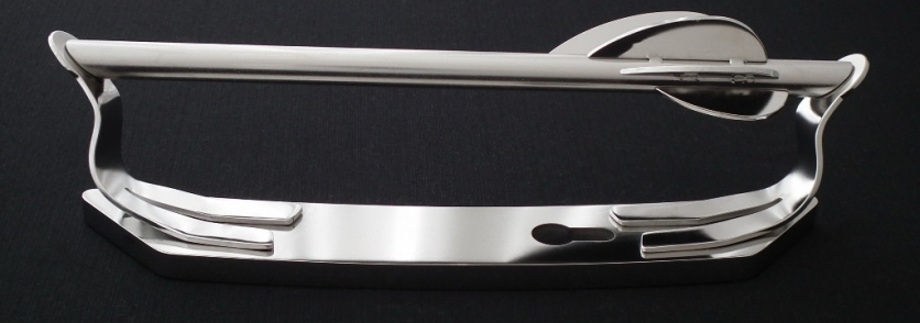 Basisplaat van massief rvs met afmetingen 12x50x315mm. Daarop twee gebogen plaatvormen met aan de twee uiteinden onder schuinte een staaf. Onder aan de staaf zijn volgens patroon een vijftal plaatvormen zichtbaar aangelast. De buitenwerkse maten bedragen 100x95x340mm (bxhxl). Het oppervlak is fijn geborsteld en daarmee zijdeglanzend van uiterlijk. Voor € 311,-