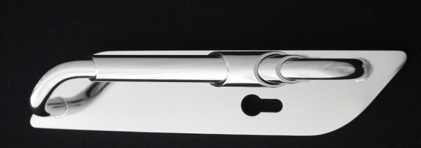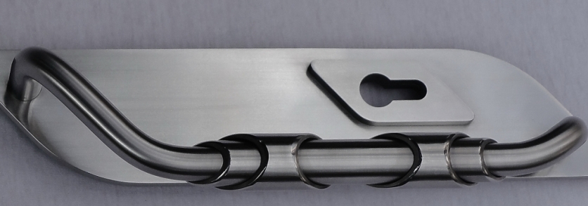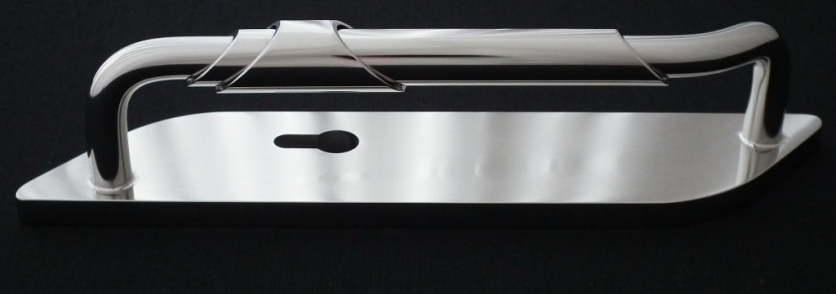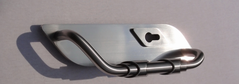 Basisplaat van massief rvs met afmetingen 80x320mm en 6 resp. 12 mm dikte. Daarop gelast een massieve staaf van rond 16mm met drie of vier bochtjes. Het aantal bochtjes bepaalt de vrije handruimte. Voor betere grip en verfraaiing is de staaf voorzien van enkele buisdelen met eindafschuining. De totale hoogte bedraagt circa 80mm. Het oppervlak is fijn geborsteld en daarmee zijdeglanzend van uiterlijk. Vanaf € 315,-